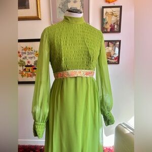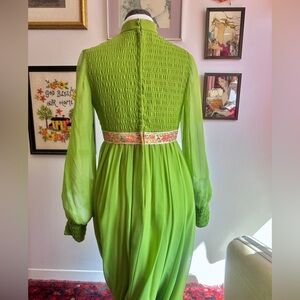 This stunning 1970s chartreuse chiffon gown channels both Victorian romance and medieval elegance. Featuring a smocked bodice, high neckline, sheer bishop sleeves with smocked cuffs, and a flowing floor-length skirt, it’s finished with a beautiful embroidered empire waist detail for a touch of bohemian charm. The semi-sheer overlay drapes gracefully over a full-length lining, creating gorgeous movement with every step.