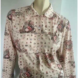Vintage 1970s ‘Paris Star’ blouse. Peachy-beige color with brown, pink and blue flower. Has buttons down front and at cuffs.