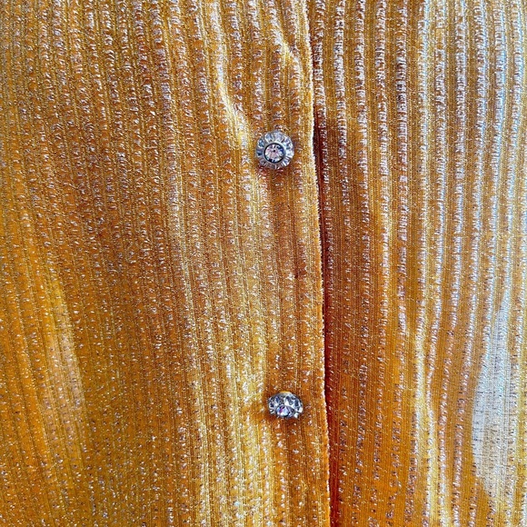 Channel Studio 54 in this dazzling 1970s gold disco blouse, crafted from a lightweight semi-sheer fabric threaded with gold lurex for that perfect shimmer. It features a wide pointed collar, elegant pleated cuffs, and statement rhinestone buttons that add even more sparkle, buttons are for decoration, the blouse snaps shut.