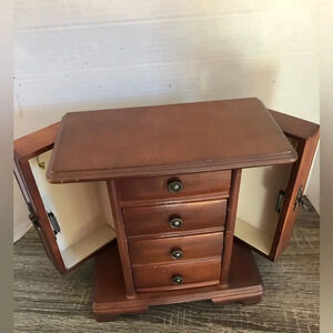 Lovely jewelry chest by Gunther Mele. Holds all of your jewelry in one place. Each side flips out to allow access to hooks for necklaces and the top flips open and has a spot for rings. Mirror on the inside of the lid and drawers underneath.