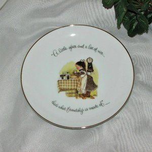 A little spice and a lot of nice...this is what friendship is made of. Vintage Holly Hobbie display plate. Depicts a brown haired girl wearing a dress and old-fashioned pinafore, baking in the kitchen.