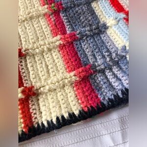 Vibrant knit blanket with stripes in a rainbow of colours. Perfect for cozying up.