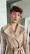 The silhouette is long and sculptural, featuring an exaggerated notched lapel, self-tie belt, and quilted rose-satin lining that adds subtle contrast and a touch of quiet glamour. It’s a coat made to move — the kind of piece that instantly transforms the wearer, evoking the effortless sophistication of 1970s icons who lived for tactile fabrics and timeless shapes.