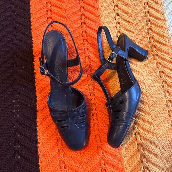 1970s Naturalizer Blue Leather T-bar Roman Mary Jane sandal heels- made in Canada!