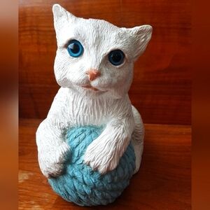 Whimsical, detailed plaster kitten playing with a ball of blue yarn. Striking, sparkly eyes in vibrant blue.