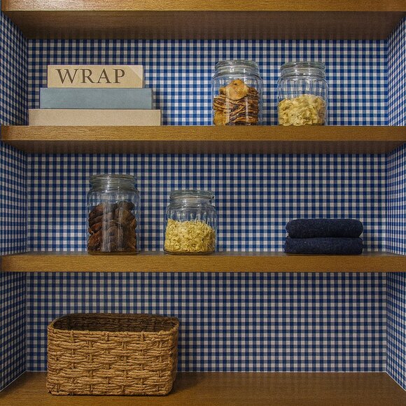 Vintage wallpaper from the 1970s. Blue and White checkered gingham pattern. Has a shiny sheen so easy to clean. One roll = 9 m x 52 cm. Vignette photos are an AI interpretation for placement ideas.