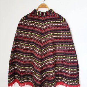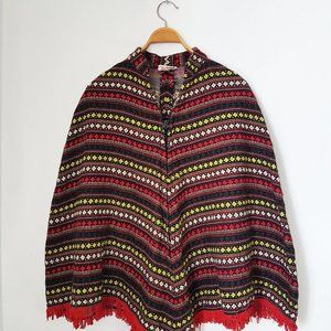 Vintage 1970s bohemian beautiful red patterned wool poncho. Zipper down front, red tassels at the bottom, two arm holes shown in photos.