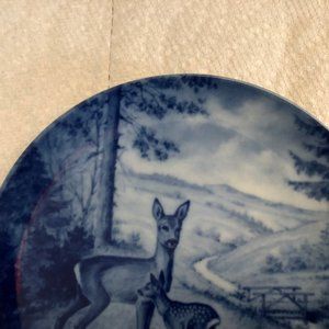 Vintage Berlin Design Collector's Plate. Mother's Day 1976. Genuine Blue China. Limited Edition Series. Made in West Germany. The scene depicts a female deer with her fawn.
