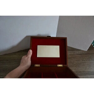 Wood box with divided interior. Felted with red fabric, it has a mirror on the lid on the inside for use while putting your earrings on. It has a decorative handle on the front but it does not lock.