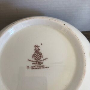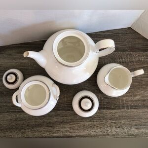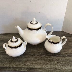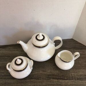 Listing includes: one creamer, one covered sugar, and a tea pot with lid. White porcelain with a brown band and gold detailing. Made by Royal Doulton. Pattern name is Harrow. Dated on the bottom 1979. This is likely a retired pattern and is not likely to be in production any longer.