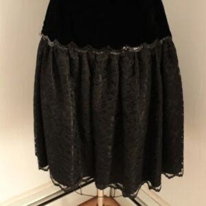 A 1980's Algo-Ettes dress in excellent condition. The bodice is velvet, trimmed with sequinned lace, and the skirt is done in three layers (lace, satin, tulle) as shown in pictures.