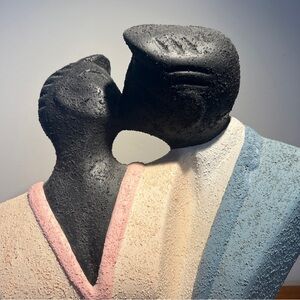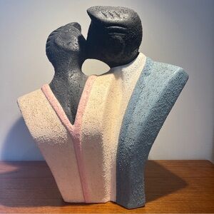 This vintage Hollywood Regency art deco sculpture depicts a kissing couple in a stunning pink and blue colorway. Produced in 1980 using 3D modeling techniques, the large bust is made of plaster and ceramic & porcelain materials. The original piece is an unknown artist's creation and is a perfect addition to any art or sculpture collection.