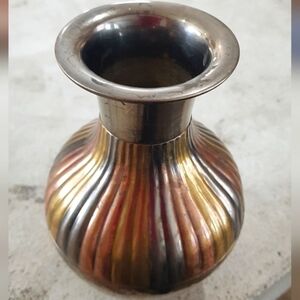 Solid brass vase with two tone horizontal stripes detail on bottom, multi tone vertical ribbed detail in the center, and fluted at the top.