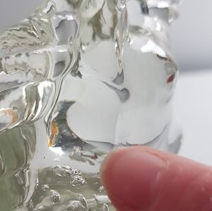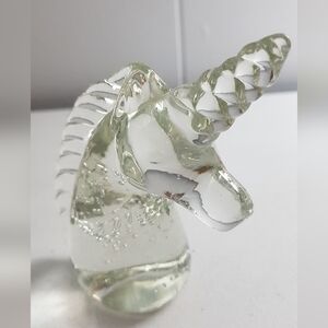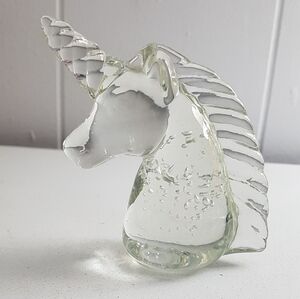 Clear, sparkling heavy glass unicorn head with whimsical bubbles. Magical paperweight or art glass office decor piece.