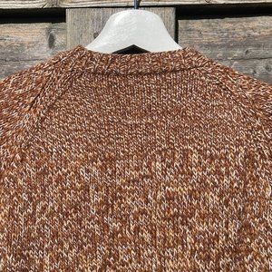 Retro, hand-knit brown with beige flecks, cardigan sweater. Very soft, warm and cozy. Not itchy. Missing one button. I wore this sweater on the regular and it is not worse for wear. It has held it's own over time.