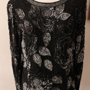 1980's Oleg Cassini Black and Silver Beaded Long Sleeve Blouse