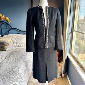 1980s Vintage Black w White Embroidered Trim Skirt and Blazer Suit Set