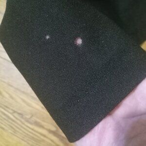 Is stretchy &will fit a variety of sizes Small to medium Best fit us sizes 4-6could fit 8 No major damage but it shows signs of its age There's One tiny pin hole in bottom right hem & one even tinier than that right next to each other at the bottom (pictured) isn't super noticeable when wearing & could easily be repaired (you could roll the hem up a turn & raise it & the holes would be gone- or you could even add a ruffle over the area with the hole if you have basic sewing skills-or you could wear a black slip under the dress& it would blend in and disguse the tiny burns from the secretary's dress) it definitely looks like the cherry fell off someone's ๐ฌ smoke lol & theres some light staining on the right shoulder but again it's not super noticeable it makes the taxi cab yellow in that spot look more mustard yellow &There's a few tiny spots on the back of the ruffle that look the same. Seems like someone got a drink spilled on them in this dress ๐ ๐ but it just adds to its charm the secretary partied hard,but u can barely see it