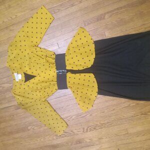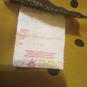 unique 1980s vintage dress by David Bradley les modes collection Montreal Quebec Canada Dress has slightly puffed sleeves with original shoulder pads Has original elastic belt with matching ruffle Yellow & black polka dots + black Buzzy Bee vibes. This dress sort of reminds me of Dolly Parton in 9 to 5- also Cardi B &dynasty &Delia Dietz - dress accentuates a variety of figures