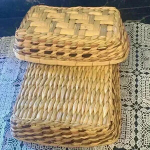 Both baking pans are in excellent condition with no chips and comes with a handwoven natural Fiber Basket.