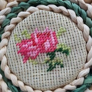 1980s Woven Rattan and Needlepoint Large Trivets