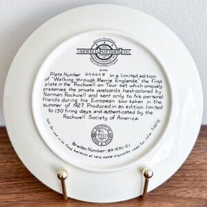 Vintage 1982 Norman Rockwell “Walking Through Merrie Englande” collector’s plate by Newell Pottery Co, plate #20262B. This is the first in the Rockwell on Tour series, based on Rockwell’s hand-colored postcards from his 1927 European trip. Limited to 150 firing days and authenticated by the Rockwell Society of America.