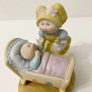1984 Cabbage Patch Kids Porcelain Figurine Girl Feeding Baby in Cradle