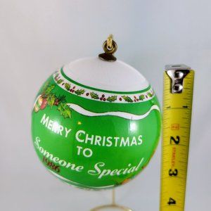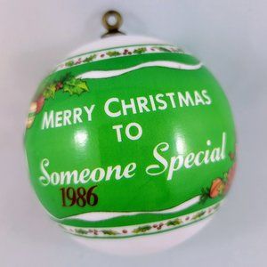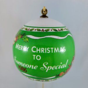 1986 Christmas Ornament Ball Silk Satin Merry Christmas To Someone Special Green Unbreakable Vintage.