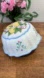 This cheerful vintage ceramic kitchen mould from the Le Cordon Bleu by The Franklin Mint (1986) collection features a vibrant hand-painted design of lemons, blossoms, and leaves surrounded by soft pastel trim in blue, pink, and green. A scalloped edge and glossy glaze give this piece an elegant, cottage-style look.