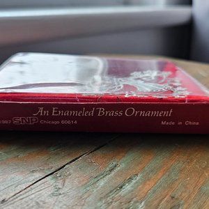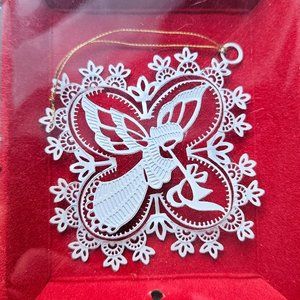 1987 Angel White Christmas Fantasy Enameled Brass Ornament by SNP Chicago. Some wear on the front of the ornament, please see images for condition.