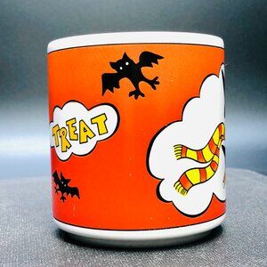 1987 Geo Z LEFTON Orange Trick or Treat Anthropomorphic Black Kitty Cat Witch Broom Vintage Coffee Mug, Retro Kitsch Halloween Ceramic Cup