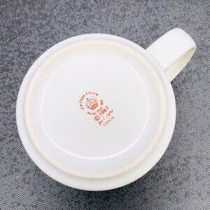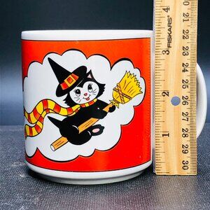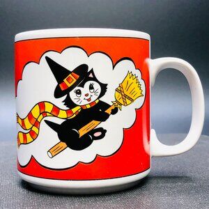 1987 Geo Z LEFTON Orange Trick or Treat Anthropomorphic Black Kitty Cat Witch Broom Vintage Coffee Mug, Retro Kitsch Halloween Ceramic Ironstone Cup
