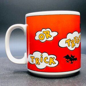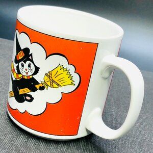 1987 Geo Z LEFTON Orange Trick or Treat Anthropomorphic Black Kitty Cat Witch Broom Vintage Coffee Mug, Retro Kitsch Halloween Ceramic Cup