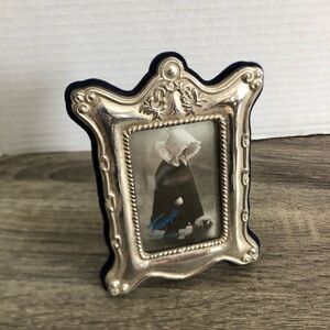Display your cherished memories with this elegant silver photo frame. Its classic design adds a touch of sophistication to any room. Silverplate intricate design photo frame. Holds a 2”x 3” photo I believe.