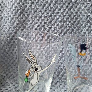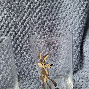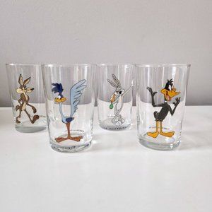A cartoon classic, Looney tunes! This set of 4 juice glasses were made in 1989. There is one character on each - Bugs Bunny , Wile Coyote , Road Runner , and Daffy Duck. There are in near mint condition! These glasses are juice size measuring 4 inches tall and 2.5 inches in diameter at the rim and they stack for easy storage.