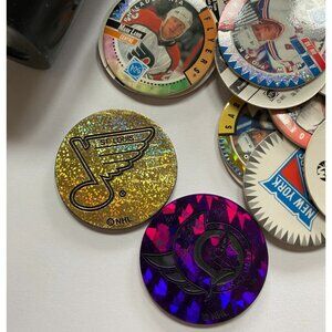 Random lot of 1990s Hockey Pogs with Canucks collector tube and two slammers!