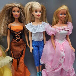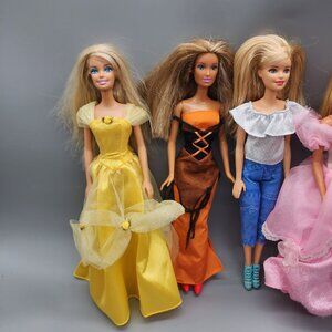 Vintage Mattel Barbie dolls lot of 4 from 1998-1999. Includes 4 dolls in assorted princess-style dresses and outfits: yellow gown, pink ballgown, orange Halloween dress, and modern top/jeans set. Dolls have signs of play, with some hair frizz and minor wear. Marked Mattel 1998/1999. Perfect for collectors or doll lovers.