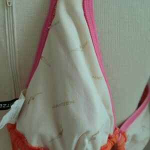 An orange Jantzen bikini, likely 1990’s in very good condition. There is some minor chlorine damage to one of the strings as shown. The top is soft cup style. The top is size small, the bottom size medium.