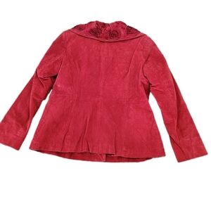 Genuine vintage suede snap and zipper close women's fitted jacket with wide, rose embellished collar from the Pamela McCoy Couture line. Front zipper pockets and interior slide pocket. Removable underarm shields to protect the leather.