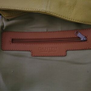 A 1990's ladies tan and yellow leather Danier cross body purse, in very good condition. There are some superficial scuffs and marks on the outside as shown, as well as a few ink marks on the lining. The purse lining is yellow cotton. There is a mended spot as shown, with stitching that doesn't quite match the rest of the purse.