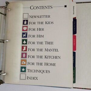 A large binder filled with Christmas cross stitch patterns, helpfully organized into categories like For Kids, For Him, For the Tree, For the Mantel, For the Kitchen, For the Home, and Techniques!