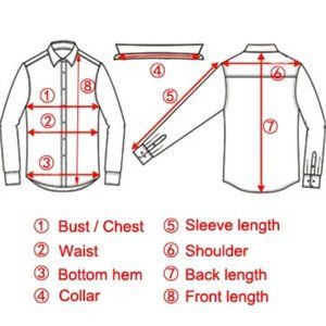 (1)Bust/Chest- 21" / (2) Waist- 19.5" / (3)Bottom hem- 18" / (4)Collar- 16.5" / (5)Sleeve length- 25" / (6)Shoulder- 18.5" / (7)Back Length- 27" / (8)Front Length- 28.5"