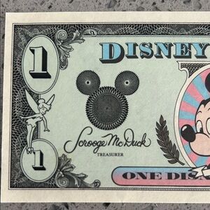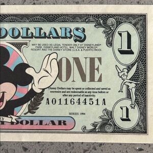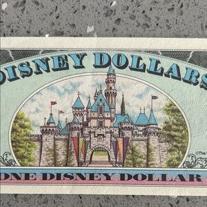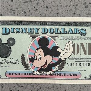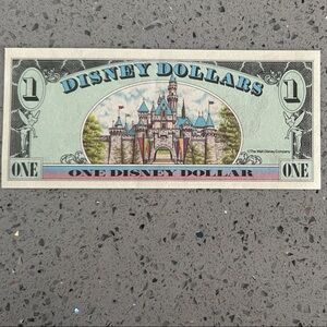 This 1994 $1 Disney Dollar featuring Mickey Mouse is a collectible currency issued by The Walt Disney Company as part of the Disney Dollars series. This particular note showcases Mickey Mouse on the front and Sleeping Beauty's castle on the back. It was released during a Disney event in 1994, making it a special addition to any Disneyana collection. This is in pristine condition with no creases or wear.