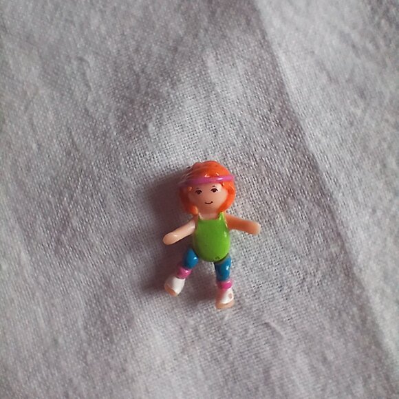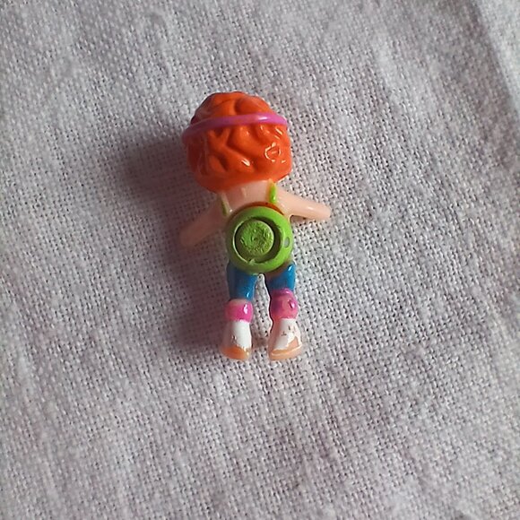 This 1994 vintage doll is approximately 1" Tall. From 1994 Polly Pocket Magical Mansion Playset - Pollyville. Rachel is her name, has curly red hair, pink sweat band and socks, green body suit, blue tights, white shoes, tan base, and legs split.