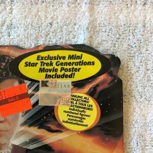 Canadian Bilingual Packaging. Features exclusive mini Star Tek Generations movie poster in box, Ceremonial War Club, Klingon Disruptor, Klingon Knife, Klingon Combat Sword, Star Trek Generations Action Base.