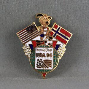 Up for sale is a vintage World Cup of Soccer pin. It is a pin for the 1994 World Cup which was held in the USA. The upper portion of the pin has Striker with an American flag on one side and a Norwegian flag on the other side. Underneath is the 1994 World Cup logo on a globe. This pin is an inlaid pin. What a great addition to any soccer pin collection.
