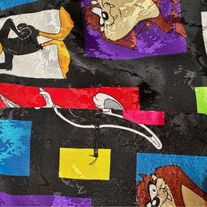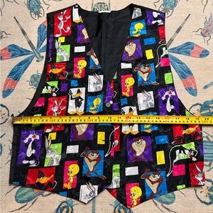 This Warner Bros vest combines a sleek black and red color scheme with playful cartoon designs, making it a standout piece in any wardrobe. The vest's vibrant patterns and modern style ensure a bold and eye-catching look, perfect for adding a touch of fun to your outfit. Missing 1 button in the center shown in photo.