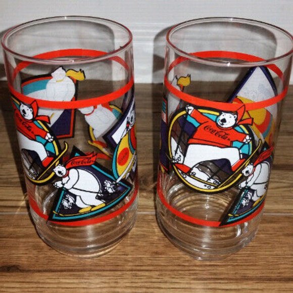 1995 Coca-Cola Polar Bears Winter Sports Tumbler Drink Glasses Set of 2