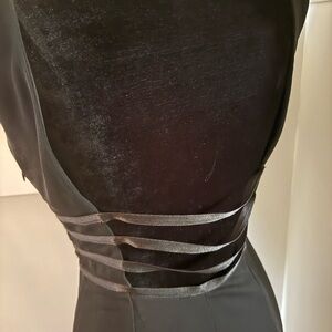 This elegant black sleeveless dress is perfect for any occasion. Its sleek design offers a timeless look. Vintage from 1995. Deep V neckline with satin trim. Zipper on side. Made in Italy and is authentic. UK size 42, US size 10.