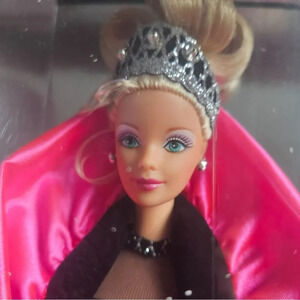 1998 Happy Holidays® Barbie® doll presents her sophistication and elegance dressed in a holiday theme gown in rich black velvety fabric with exquisite silver glitter accents - she is truly something special as the only doll in the series to wear black. A pink cape and jeweled tiara accent this stunning ensemble. As a bonus, this doll carries the distinction of the being the first in the Happy Holidays series to wear her hair styled in an elegant upsweep.